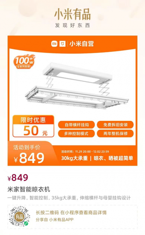 米家智能晾衣機在2020年5月上市入局智能晾曬行業(yè),短短兩年間達成100萬的銷量,收獲了百萬用戶的信任,為百萬個家庭送去了新奇有趣的智能晾曬新體驗。在這百萬銷量的背后,離不開小米的超強品牌實力,更離不開百萬用戶的支持與陪伴。