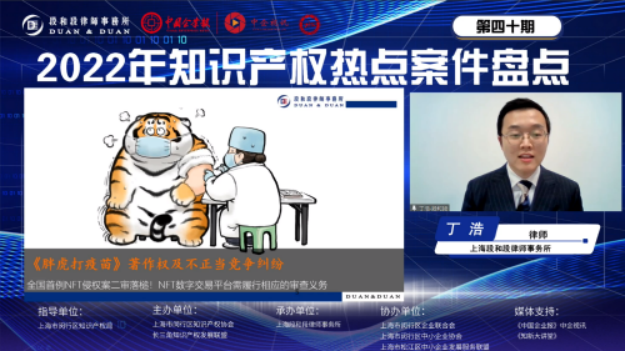 尊重和保護(hù)知識(shí)產(chǎn)權(quán)方得始終 丁浩盤點(diǎn)并解讀了2022年著作權(quán)及商標(biāo)熱點(diǎn)案例,重點(diǎn)介紹了全國首例NFT侵權(quán)案:《胖虎打疫苗》著作權(quán)及不正當(dāng)競爭糾紛、嗶哩嗶哩商標(biāo)無效行政訴訟、范斯公司(VANS,INC.)與高志龍等侵害商標(biāo)權(quán)糾紛案和搬酒網(wǎng)不正當(dāng)競爭糾紛案。